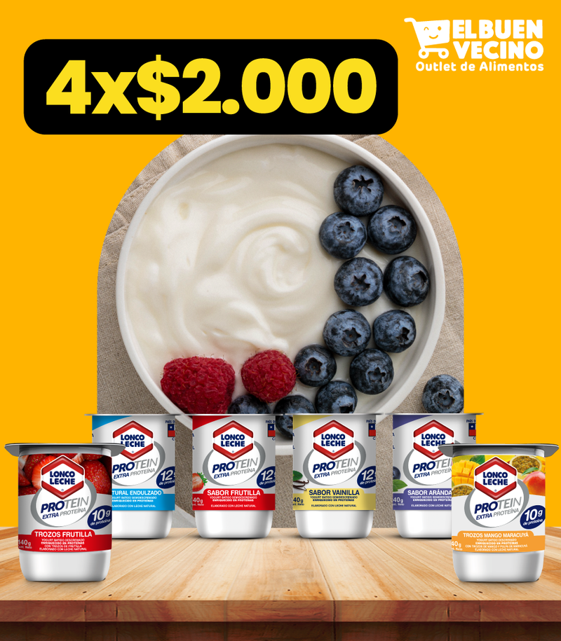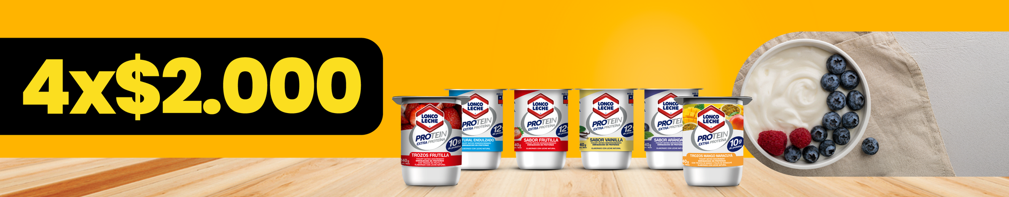Precio original $2.200Precio original $2.200 - Precio original $2.200Precio original $2.200Precio actual $2.000$2.000 - $2.000Precio actual $2.000Yogur Protein Natural Endulzado Loncoleche 4x140g